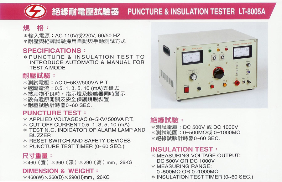 Product Name : | 絕緣耐電壓試驗器 Puncture & Insulation Tester - LT-8005A |