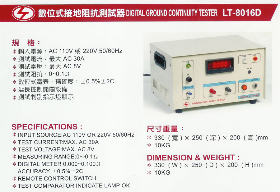 Product Name : | AC Ground Continuity Tester 交流接地阻抗測試器 - LT-8016D |