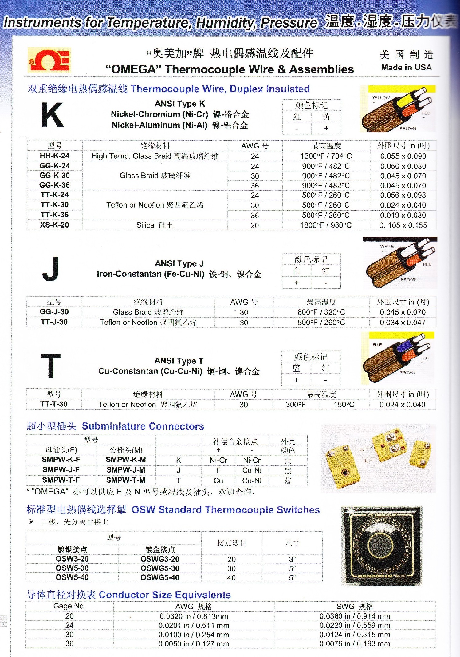 Omega Thermocouple Wire & Assemblies 奧美加熱電偶感溫綫及配件